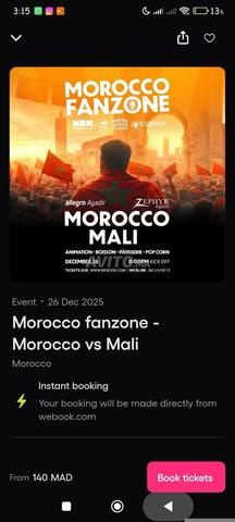 2 تذكرة Morocco vs Mali في ZEPHYR HOTEL