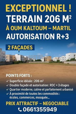 لا تفوت هذه الفرصة الفريدة لامتلاك أرض ممتازة بمساحة 206 متر مربع في تجزئة أم كلثوم المرغوبة في مارتيل. مثالية لمشروع سكني راقي أو إقامة إيجارية مربحة أو استثمار آمن.