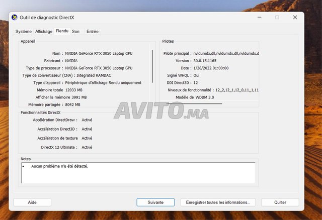 Carte graphique dédiée : NVIDIA GeForce RTX 3050 Laptop GPU