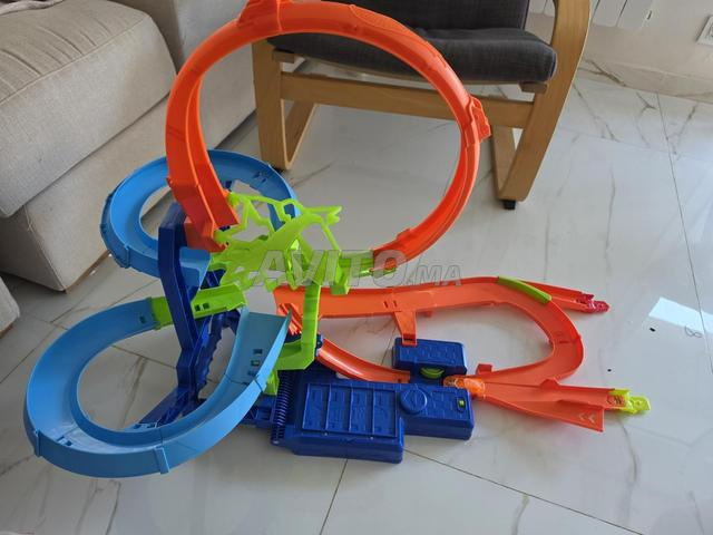 Le lanceur motorisé propulse immédiatement les voitures sur la piste, les fait passer dans une boucle, puis enchaîne avec un saut, franchit 2 virages et les renvoie automatiquement pour recommencer la course.