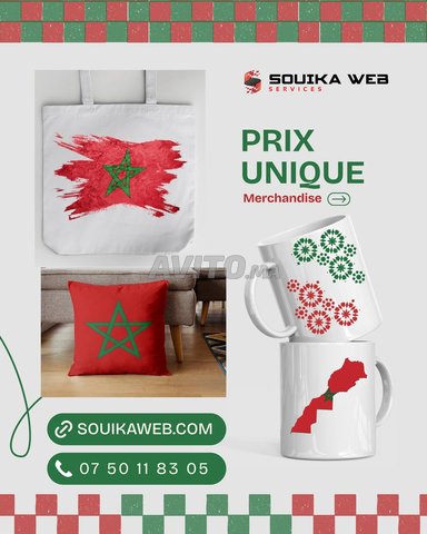 Collection exclusive Souika Web : mugs, coussins et tote bags décorés aux couleurs du Maroc. Impression haute qualité et finitions durables.