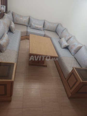 Salon marocain en tres bon etat avec table centrale, en forme de U, bleu et dore Mesures: deux cotes 3,65 M , un cote 2,82 M, profondeur d'assise 70 cm Prix 12000 dh