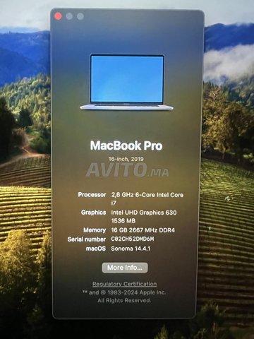 Je vends mon Macbook en état comme neuf i7 2019, 16 pouces, touchbar, double carte graphique, 512 Go, 16 Go de RAM, très peu utilisé avec 100 cycles de charge. La configuration est sur les photos, avec chargeur original 96W.