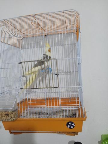 Oiseau cocktail dressable en bonne santé avec sa cage.