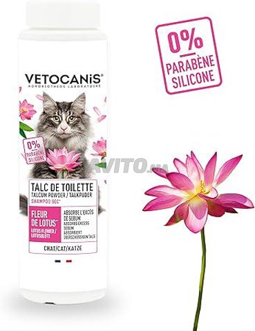 Vetocanis vous propos un shampoing pour chat sans rinçage sous forme de talc de toilette. Ce soin pour le toilettage du chat est un shampoing sec naturel, lègérement parfumé à la Fleur de Lotus.