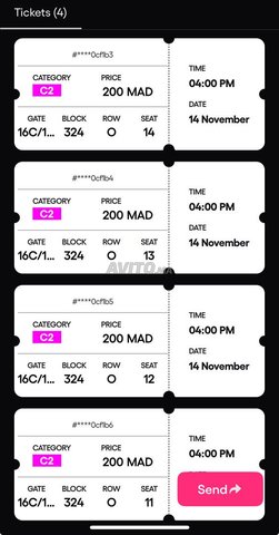 Je vends 4 billets côte à côte en catégorie 2 pour le Match Maroc vs Moz au nouveau stade de Tanger,