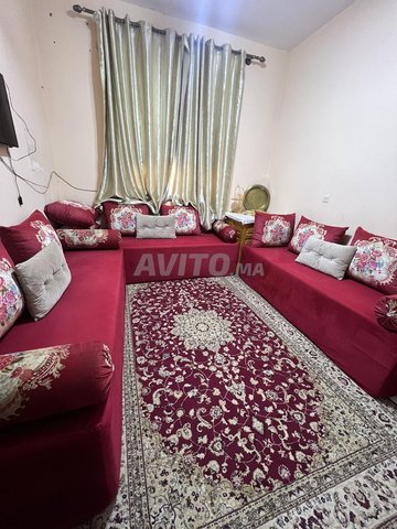Je vends un salon marocain complet en velours rouge bordeaux, très propre et confortable.