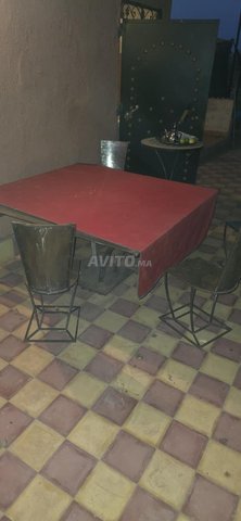 - table lourde en fer et vitre avec chaises