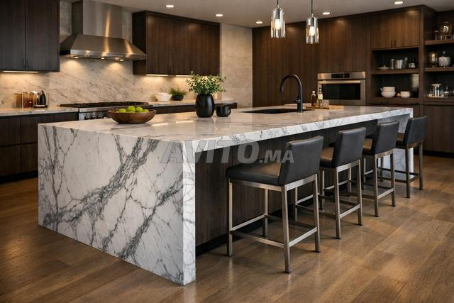 Ilot central style cascade pour cuisine moderne haut standing Nous proposons selection des dalles gabarit sur place decoupe precise assemblage joints propres et pose avec alignement parfait Ideal architectes decorateurs et projets villa Cette image est faite pour capter des demandes Avito ilot marbre granit sur mesure plan de travail premium et finition nette