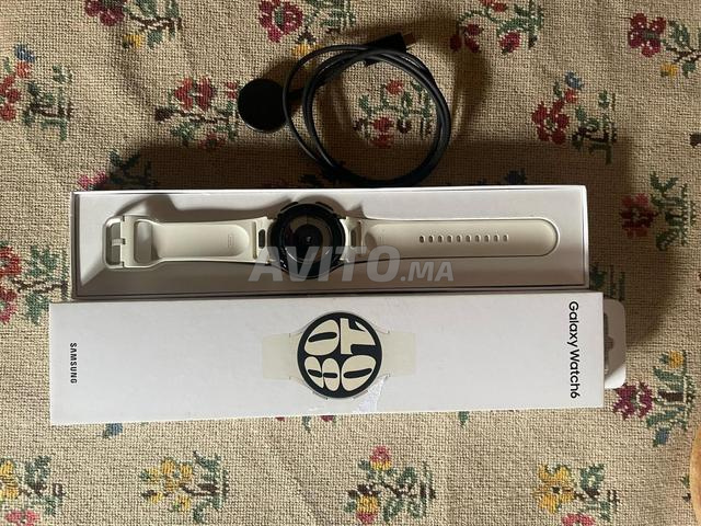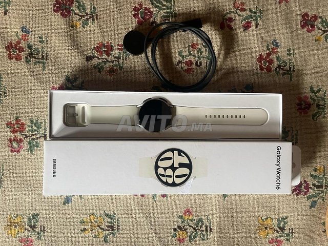 Je vends une Samsung Galaxy Watch 6, modèle 40 mm, couleur argent (cadran) avec bracelet blanc.