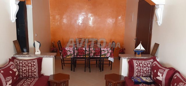 appartement équipé : 1 salon, 1 salle de bain et 1 WC, 2 chambres, à louer Assilah 5 min de la plage, tv, cuisine bien équipée : machine à laver et réfrigérateur + chauffe-eau + four + cuisinière.