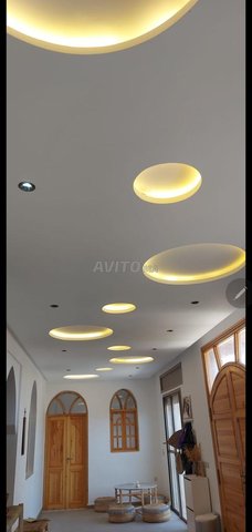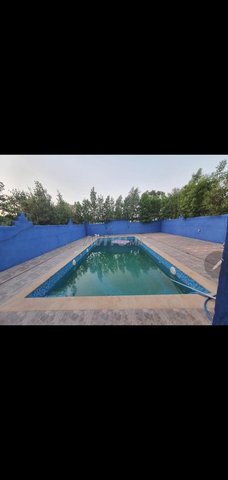 1) Maison moderne (rez-de-chaussée) avec un salon, 2 chambres à coucher, un large hall d'entrée, terrasse extérieure carrelée (carrelage beldi) Jardinet avec 2 jeunes palmiers, 2 vignes, citronnier et quelques autres arbres fruitiers, salle de douche avec tadelakt (le tout est très spacieux), cuisine ouverte équipée blanche faite sur mesure. Maison ensoleillée avec grandes fenêtres coulissantes, moustiquaires et volets électriques. Porte d'entrée et fenêtres en bois sculptées par des artisans.. Plafonds décoratifs plâtrés. Spots avec jeu de lumières colorées et blanches. . Escaliers métalliques mènant à la terrasse (stah). Cette habitation a sa propre porte d'entrée. Ensuite, vous avez un grand jardin avec une double porte métalique de garage (qui se situe à l'entrée principale, une cage pour poulailler, une grande piscine et assise de jardin construite / carrelée).