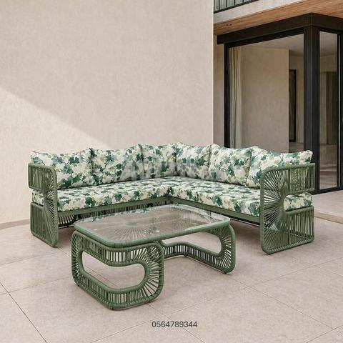 Magnifique salon de jardin alliant décoration moderne et authenticité marocaine, idéal pour terrasse, jardin, balcon ou même intérieur : riad, villa, Airbnb, café, restaurant.