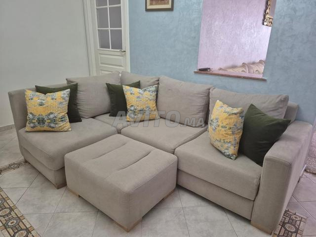 Un salon moderne de couleur beige avec ses coussins et un pouf de très bonne qualité de tissu et en très bon état.