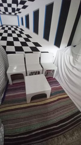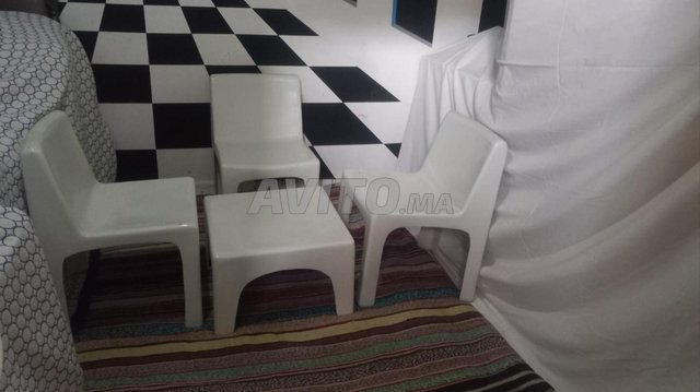 3 chaise basse avec table basse style carre et 2 fauteuil basse et table ronde et 2 porte lampe style de champignon.
