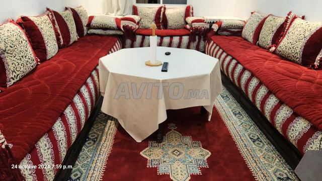 je mets en vente un salon marocain en bon état avec quelque retouche de vernis, composé d'une table avec 3 cendriers et matelas sans ressorts avec couette rouge et deux caissons sans tapis.