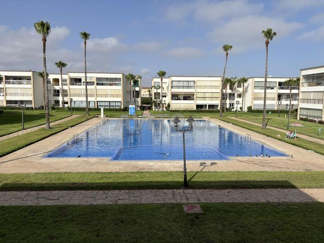 Location appartement, 100 m², VUE PISCINE à la résidence balnéaire OLA BLANCA à 30 minutes de CASABLANCA deux chambres à coucher, deux salles de bain, deux toilettes, un grand salon avec salle à manger.TV Parabole une cuisine indépendante entièrement équipée , un grand balcon qui contient un séjour et une salle à manger l’appartement en face de la piscine, plusieurs terrains multisports, animation jour et soir ,parc de jeux pour enfants un restaurant, un café, une supérette, femmes de ménage disponibles sur place accès direct à une immense plage