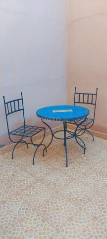 Je mets table jardin avec 2 chaises en fer forgé zellige bleu et jaune