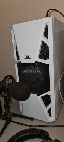 - PC gamer streamer avec trois monitores, casque,