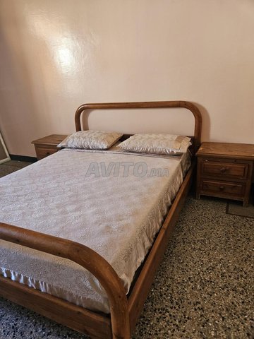Je mets en vente un lit en bois avec ses commodes assorties, le tout en bon état, accompagné d'un matelas Simmons.