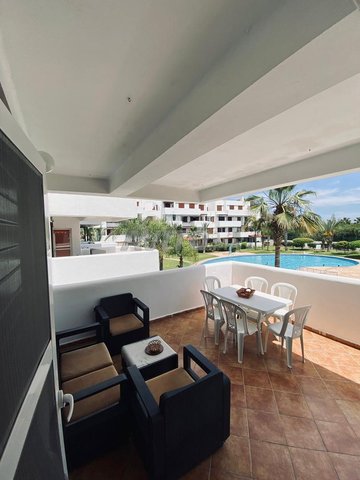 L'appartement est en 1er étage et elle se compose de : 1 Chambre à coucher , 1 Grand Salon , 1 Salle de bain , 1 Cuisine Américaine bien équipée et 1 terrasse avec une belle vue sur la piscine .Pour plus d’informations contacte nous