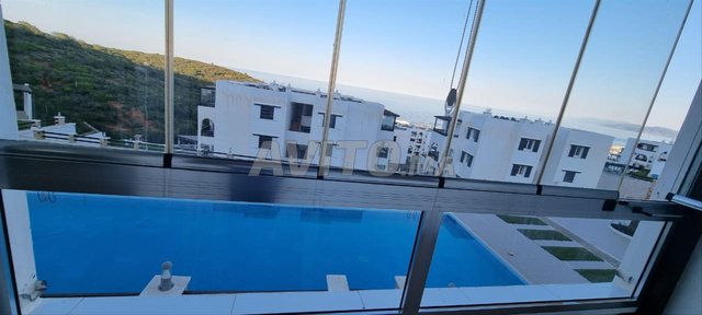 2 chambres 2 salons une salle de bain wc cuisine toute équipée grande terrasse vue sur piscine et parking.