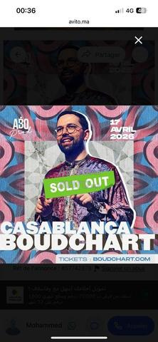 Je vends 2 billets pour le spectacle de Boudchart à Casablanca.