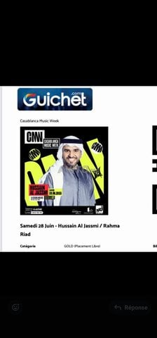 A vendre ticket pour spectacle Hussein El Jasmi du 28 juin 2025 lieu Parc de la ligue Arabe Casablanca