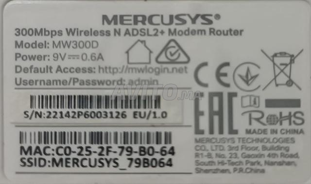 Je mets en vente un modem routeur ADSL2 avec Wi-Fi N (300 Mbps) (bon état) de la marque Mercusys, disponile sur Tétouan, Martil et Chefchaouen.