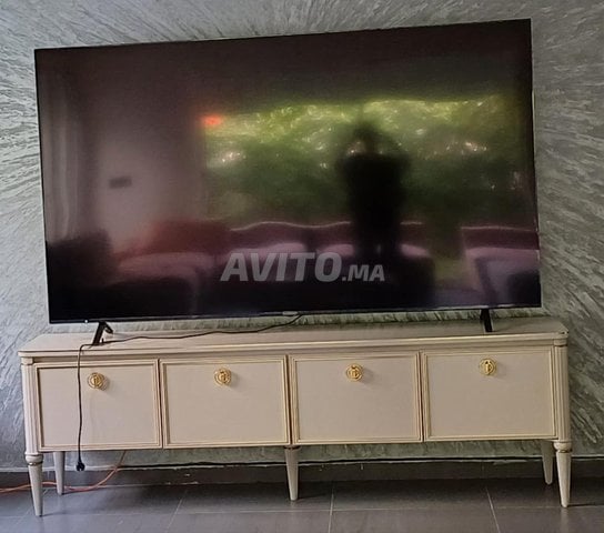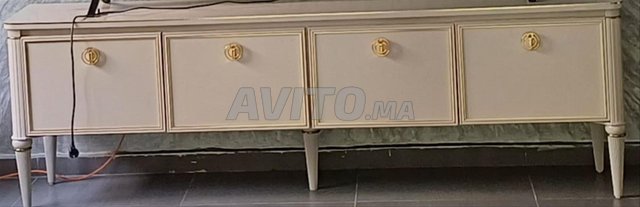 A vendre très beau meuble TV (grand écran 86 pouces comme sur la photo, largeur 195 cm. En bois clair avec 4 portes et étagères, largeur totale 210 cm