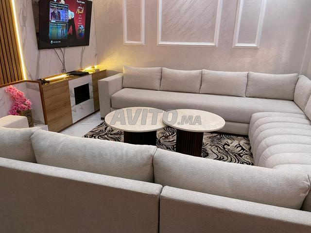 Salon moderne avec tapis et table marbre tissu bouclette bonj dolidol métrage 3/3/3,2