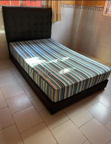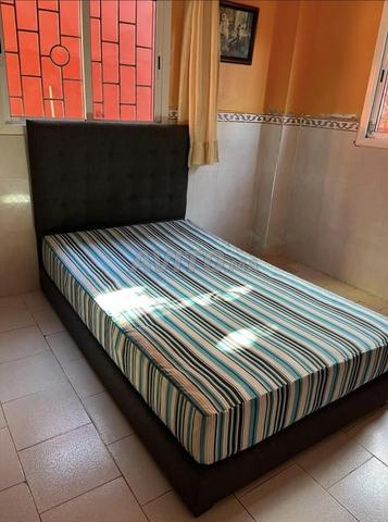 Vends ensemble literie complet comprenant un lit double de 120x200cm avec un sommier tapissier en tissu gris et son matelas.