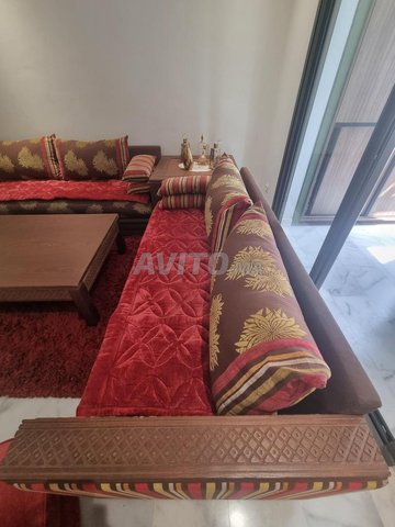 salon richbond forme L 2m×3m, chaise rembourrée, table boix massif 90cm×110cm, tapis 240cm×165cm, coin à rangement 88cm×88cm