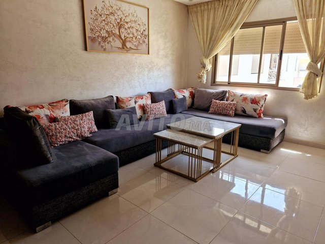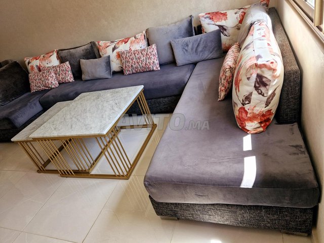 Un grand salon sous forme d'un U en excellent état avec un ponge 33 et tissus anti tache et deux tables carrés en marbre. li bghahoum merhba.
