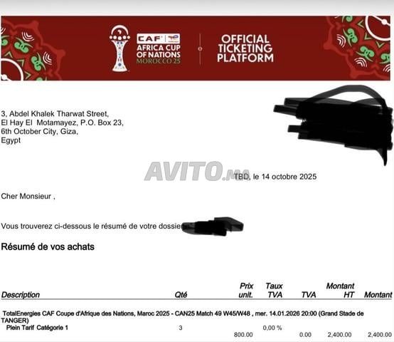 Vend 2 places en CAT1 pour la demi-finale le 14/01/2025 à 18h à Tanger.