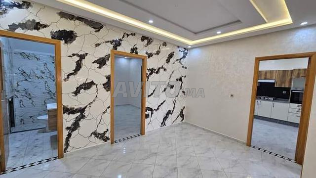 appartement à louer en centre-ville, au 2ème étage, avec un salon, deux chambres, deux salles de bains, un balcon et une cuisine équipée avec carrelage.