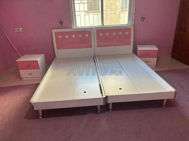 Deux grands lits en très bon état, chacun accompagné de sa table de chevet assortie. Solides, confortables et bien entretenus. Idéals pour une chambre spacieuse. Prix : 2500 pour chaque lit avec sa table de chevet,