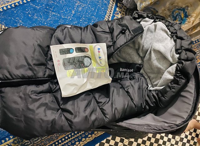 Poussette baqa neqia dial la France avec un sac de couchage et sac de pluie