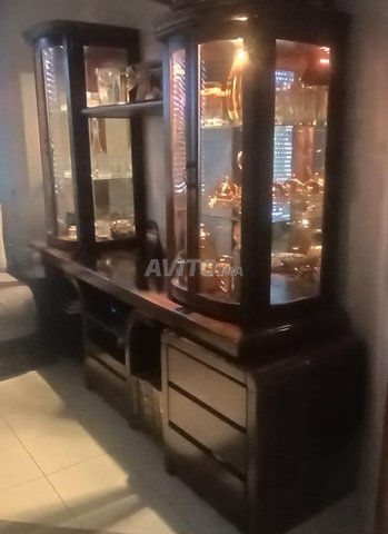 vitrine en verre et bois avec 2 vitrines avec led et 2 séries de tiroirs et grande place pour télé