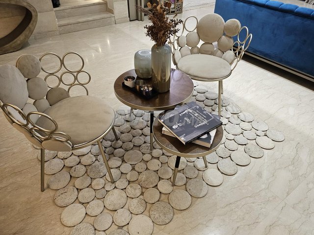 1chaises couleur beige avec deux tables de chez diva ameublement et un tapis importe de la Turquie