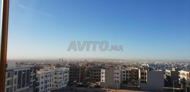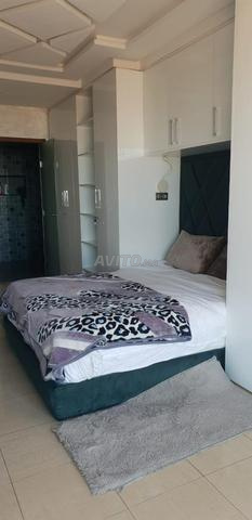 Appartement meublé luxueux au 5ème étage de 100 m² avec deux chambres, salon, cuisine équipée, séjour, toilettes, douche et Hammam marocain.