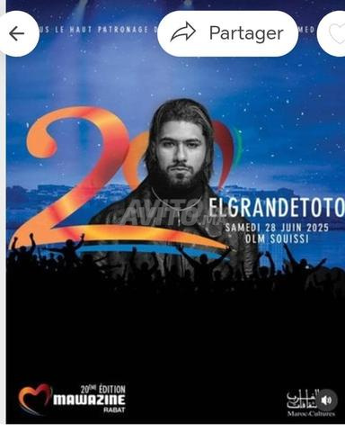Je mets en vente 2 tickets mawazin El grande toto 900 dh chzcun