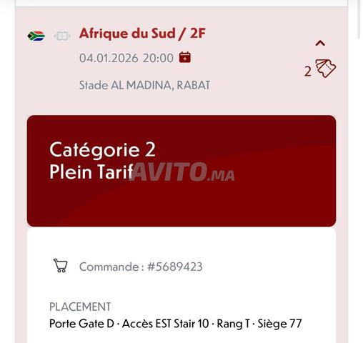 4 janvier 20h stade al Madina. Vends 2 billets 8eme de finale 500 dhs chacun catégorie 2.