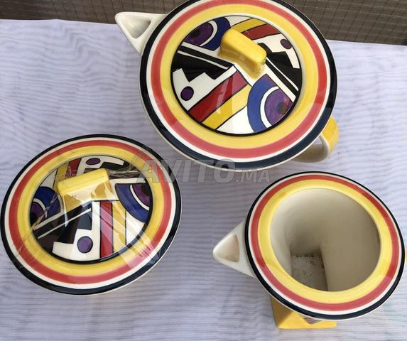 TRES JOLI SERVICE A THÉ COMPRENANT UNE THÉIÈRE, UN POT A LAIT ET UN SUCRIER. DE FABRICATION ANGLAISE DE LA POTERIE NORMAND. TRES ANCIEN ET JAMAIS UTILISÉ.