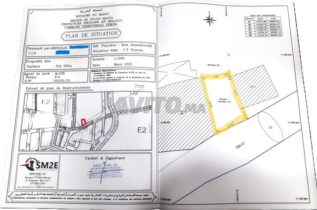 اضع للبيع بقعة ارضية مساحتها 135 متر مربع تتواجد بدوار عين سيدي بلقاسم جماعة التمسية عمالة انزكان ايت ملول واجهة واحدة طريق 10 متر كتابة عند المحامي