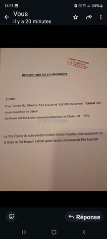 Terrain a vendre a Fès qui m appartiens a la sortie de Fès route sidi hrazem prix 750 000 dhs au lieu de 860 000 dhs 246 m2 R plus 4 Intéresser appelez moi au numéro.