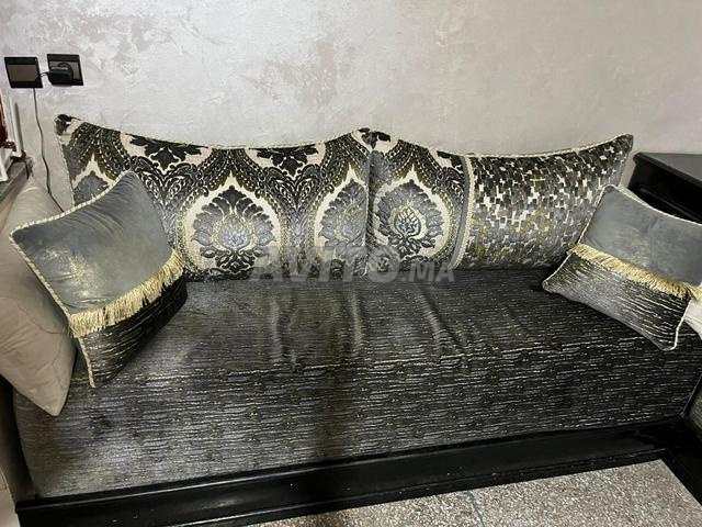 هاد الصالون اللي فالصورة كيجمع بين الطابع المغربي العصري والراحة.
