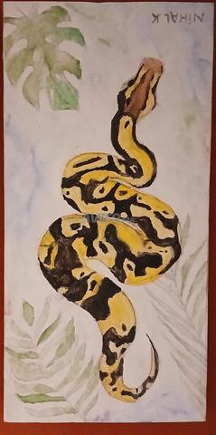 Sur ce format étroit, un python est représenté en pleine ascension. Le corps présente une alternance de taches noires et d'écailles jaune vif. Le fond est composé de feuillages tropicaux (type Monstera) peints avec de la transparence dans des tons vert d'eau et gris-bleu, créant un contraste doux avec le sujet central.