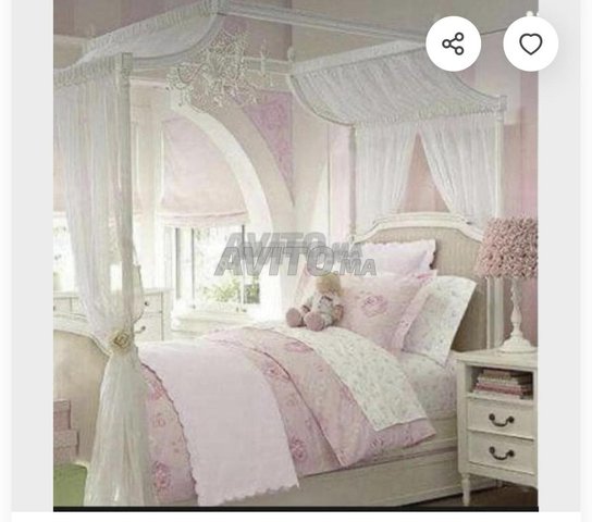 Lit baldaquin pour fille de chez cocon et papillon avec sa table de chevet et matelas rive bleu en très bon état