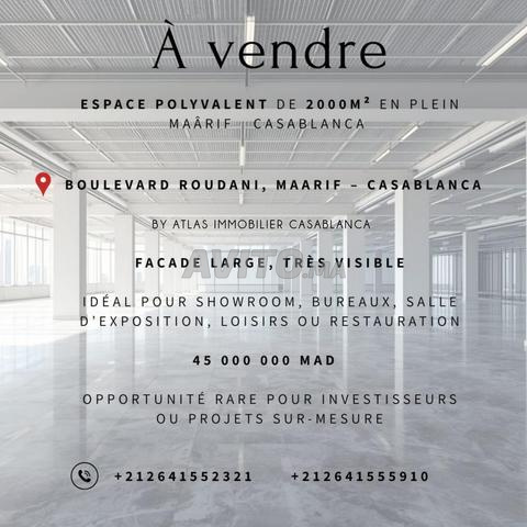 À vendre espace polyvalent de 2000 m² situé en plein Boulevard Roudani, quartier Maarif à Casablanca.